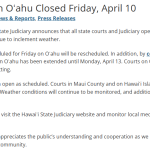 The Hawaiʻi State Judiciary announces that all state courts and Judiciary operations on Oʻahu will be closed on Friday, April 10, due to inclement weather. All hearings and trials scheduled... read more